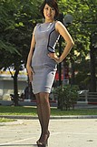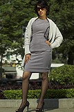 Váy da lộn ghi, lé đen