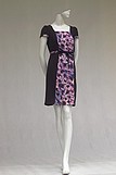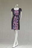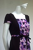 Váy xuông hoa tím pha đen, cổ vuông, tay cộc nhún, rút nhún bụng