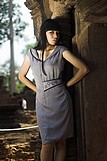 Váy lụa ghi, cổ bẻ lé đen, đai nửa bụng ren