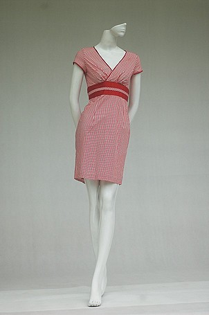 Váy xoè kẻ trắng đỏ, cổ ...